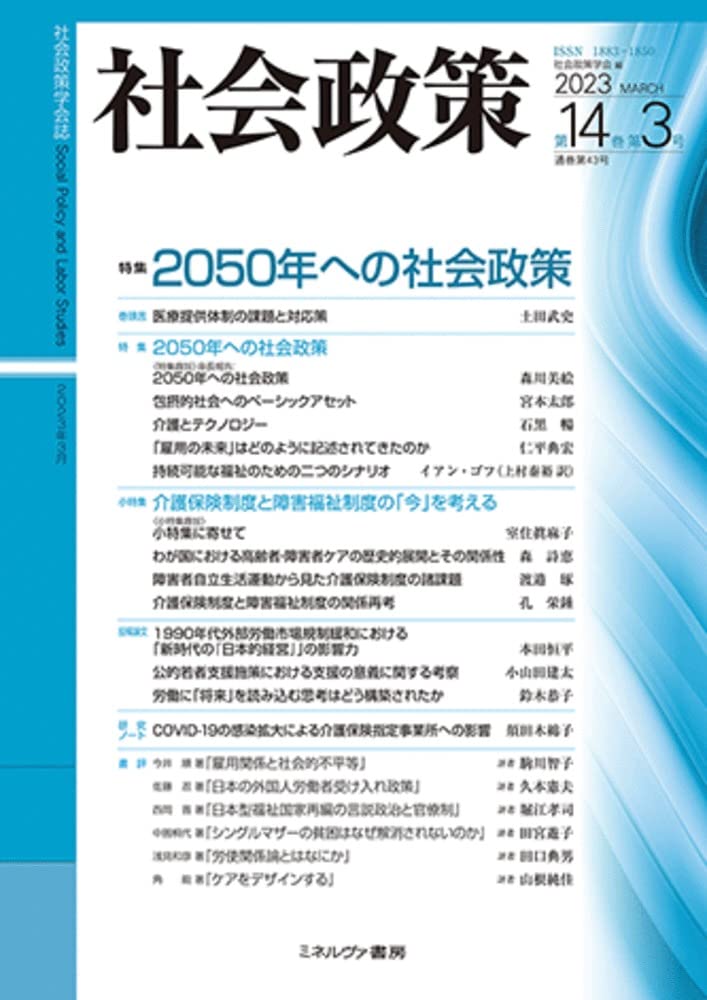 特集では、2050年の社会を念頭に、そこに向けた社会政策の構想をさまざまな立場から検討する。小特集では、障害者の高齢化に対応する介護保険制度と障害福祉制度のあり方を考える。その他意欲的な研究論文を多数収録。