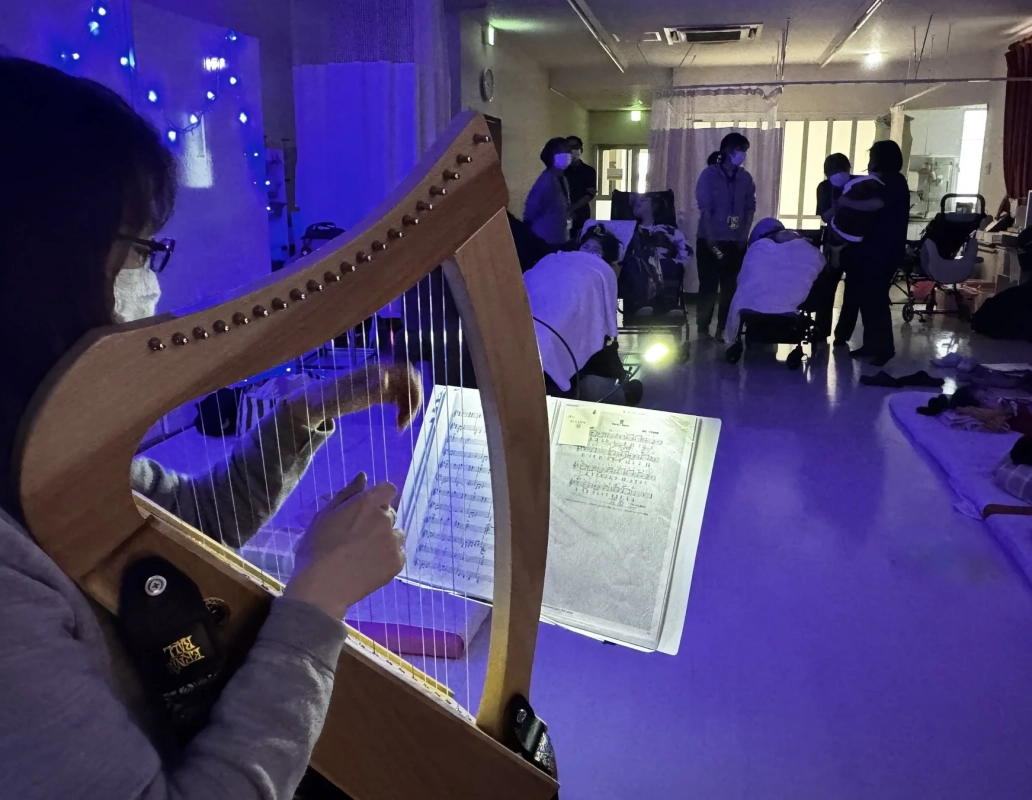 ベッドサイド訪問ハープ奏者・曽我あかね氏、社会福祉法人あいの実三施設での訪問演奏を達成