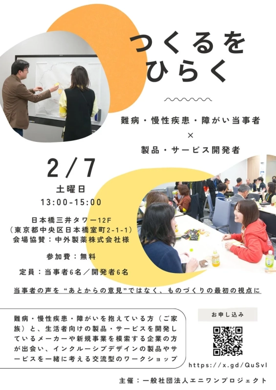 一般社団法人エニワンプロジェクトは、難病や障がいを抱える方々と製品・サービス開発者が対話を通じてインクルーシブデザインを推進する交流型ワークショップ「つくるをひらく」を2026年2月7日に日本橋で開催します。