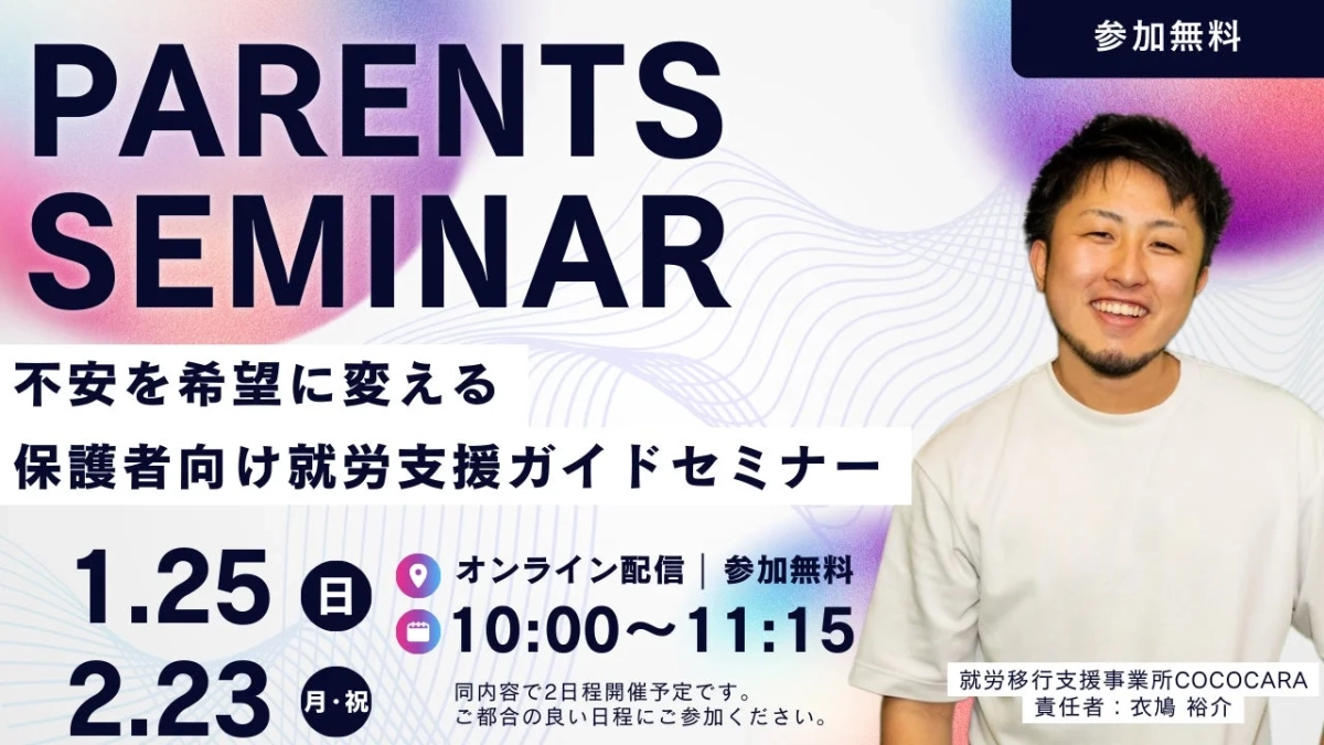 発達障がいや精神的な特性を持つお子さまの将来に悩む保護者の方へ。就労移行支援事業所COCOCARAが、就労支援の仕組みや成功事例を分かりやすく紹介する無料オンラインセミナーを開催します。