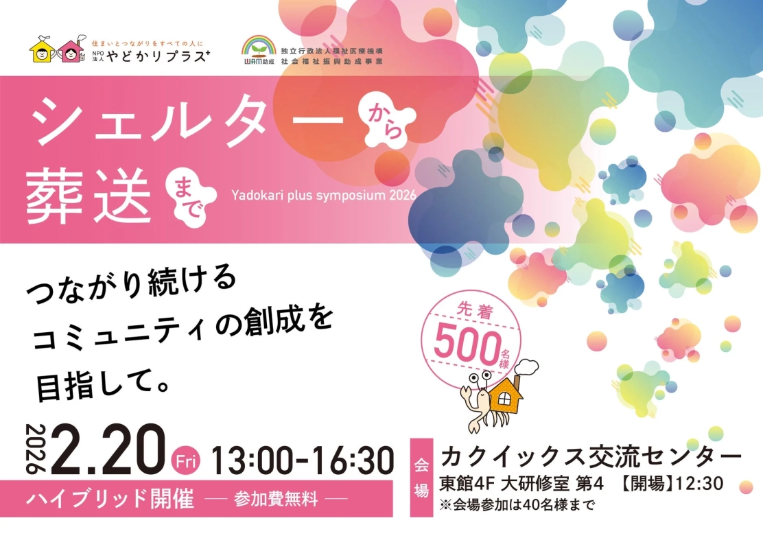 NPO法人やどかりプラスは2026年2月20日、鹿児島とオンラインで「シェルターから葬送までつながり続けるコミュニティの創成」をテーマにシンポジウムを開催します。孤独死や身寄りなしといった社会課題解決へのヒントを探る本イベントでは、同志社大学教授の永田祐氏をはじめ、各方面で支援活動を行う専門家が登壇し、多角的な視点から意見交換を行います。参加費無料で、先着500名まで参加可能です。