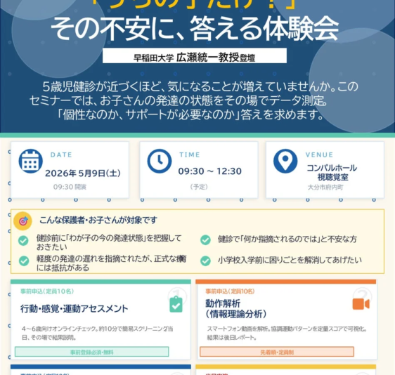 2026年5月9日(土)に大分市コンパルホール 視聴覚室にて開催される「うちの子だけ? その不安に、答える体験会」では、子どもの発達の困りごとをデータで「見える化」し、家庭でできる支援について学ぶことができます。