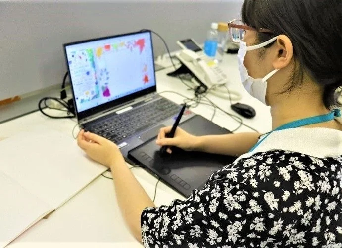 東京都ビジネスサービス株式会社でグラフィックデザインやDTP、Webデザイン等の事業に携わり、チラシ作成やデザイン、イラスト制作を担当している村田真南さん。幼い頃からイラストに興味を持ち、高校でインテリアデザイン科を専攻、美術学校でデザインや絵画を学びました。その後、就労移行支援機関でIllustratorやPhotoshopを使った本格的なチラシデザインを習得。東京都ビジネスサービス株式会社に入社後も業務と並行してデザインの勉強を継続し、令和5年度「障害者雇用支援月間における絵画・写真コンテスト」では理事長推奨賞を受賞するなど、着実にその才能を開花させてきました。