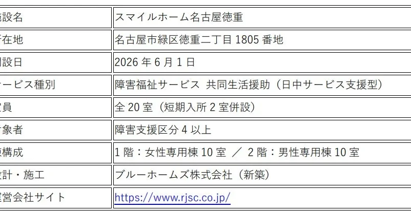 2026年6月1日に開設されるこの施設は、中~重度障がいを持つ方向けの日中サービス支援型グループホームとして、中部エリアにおける障がい福祉の拠点となることが期待されています。