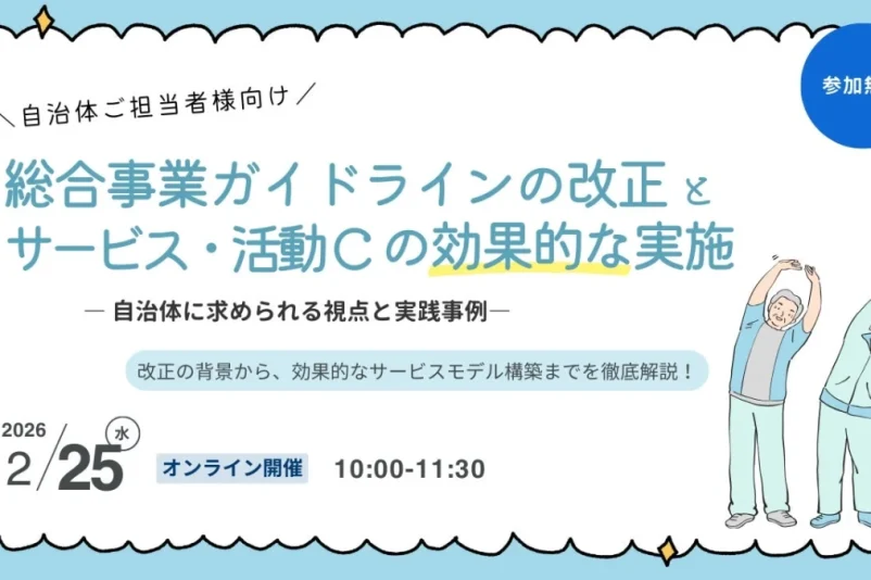 株式会社ルネサンスは、2026年2月25日(水)に、自治体関係者を対象とした無料オンラインウェビナー「総合事業ガイドラインの改正とサービス・活動Cの効果的な実施~自治体に求められる視点と実践事例~」を開催します。本ウェビナーは、総合事業ガイドラインの改正を契機に、地域で広がるサービス・活動Cの可能性を探ることを目的としています。