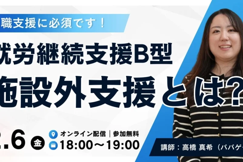 | イベント名 | 就職支援に必須!就労継続支援B型の「施設外支援」とは?【支援者向けオンライン研修会】 |