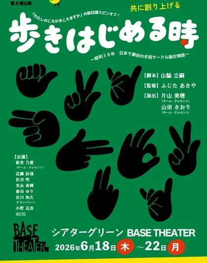 チーム・クレセントが主催する第8回公演『歩きはじめる時』は、2022年に第29回OMS戯曲賞大賞を受賞した山脇立嗣氏の脚本「わたしのこえがきこえますか」の前日譚スピンオフ作品です。この舞台は、昭和38年という手話が禁じられていた時代を背景に、日本で初めて手話サークル「みみずく」を立ち上げた一人の看護学生の物語を実話に基づいて描きます。