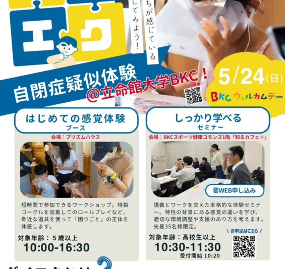 特定非営利活動法人ADDSは、2026年5月24日(日)に立命館大学びわこ・くさつキャンパス(BKC)で開催される地域交流イベント「BKCウェルカムデー2026」に出展し、「ダイエク(Diversity Experience)」をテーマとした自閉症疑似体験セミナーとワークショップブースを運営します。独自開発の特製ゴーグルや集音器を使用し、発達障害の特性を「知識」としてだけでなく、「肌で感じる体験」として提供することで、誰もが過ごしやすい社会への第一歩を提案します。