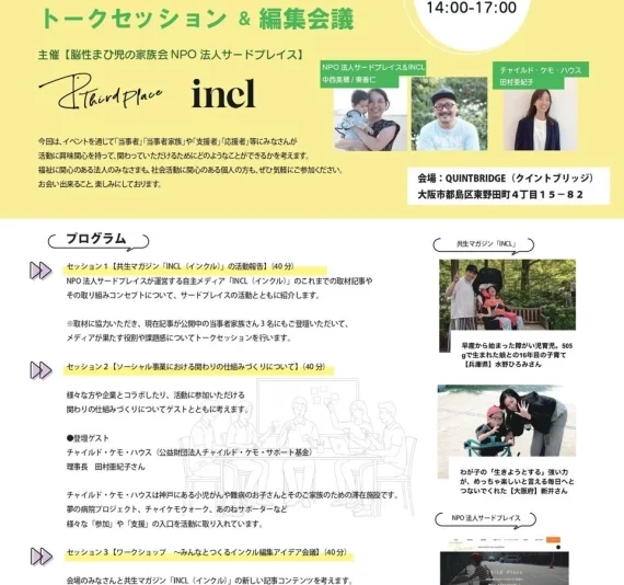 NPO法人サードプレイスが運営する自主メディア「INCL」のこれまでの取材記事や活動コンセプトが紹介されます。取材に協力した当事者家族3名も登壇し、メディアが果たす役割や抱える課題についてトークセッションが行われる予定です。