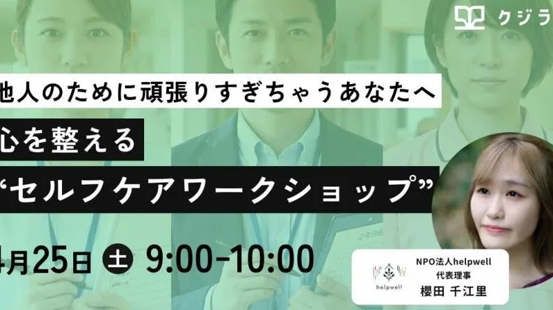 このような課題に対し、対人支援職のバーンアウト予防に取り組むNPO法人helpwellと、社会を支える人々の「キャリアの多様性」を大切にする株式会社クジラボが連携し、オンラインイベント『心を整えるセルフケアワークショップ』を2026年4月25日(土)に開催します。
