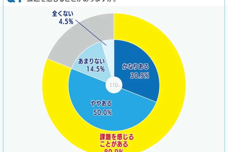 「お勤め先における支援方法について、課題を感じることがありますか」という問いに対し、「かなりある」が30.9%、「ややある」が50.0%となり、合わせて80.9%の支援員が現状の支援方法に課題を抱いていることが判明しました。