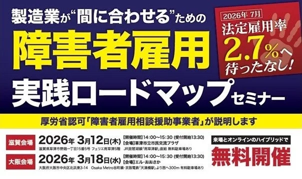 2026年7月の法定雇用率引き上げは、障害者雇用への取り組みを一層重要にします。この無料セミナーは、法定雇用率未達成や障害者雇用に悩む製造業の企業にとって、具体的なノウハウと解決策を得る絶好の機会です。