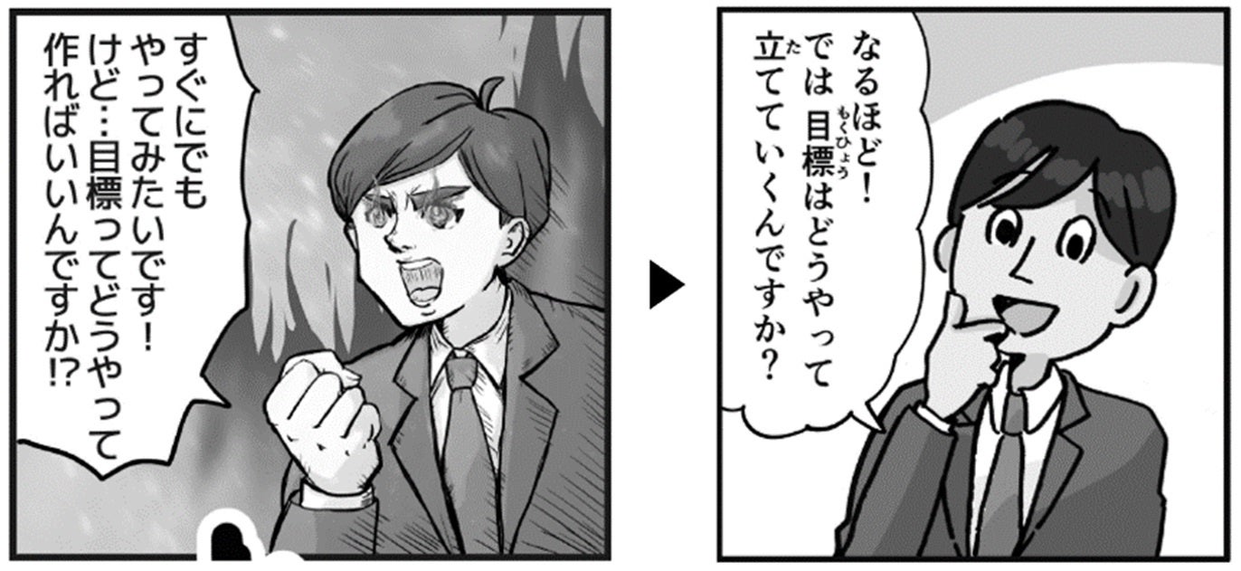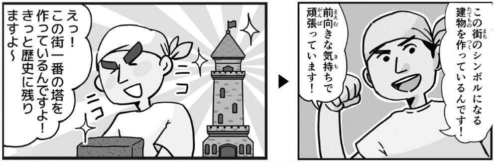 場面を示す背景や表情による心理表現などを抑えてセリフで伝えることで、わかりやすさを向上(左のコマの各種情報を右のコマでは抑制)