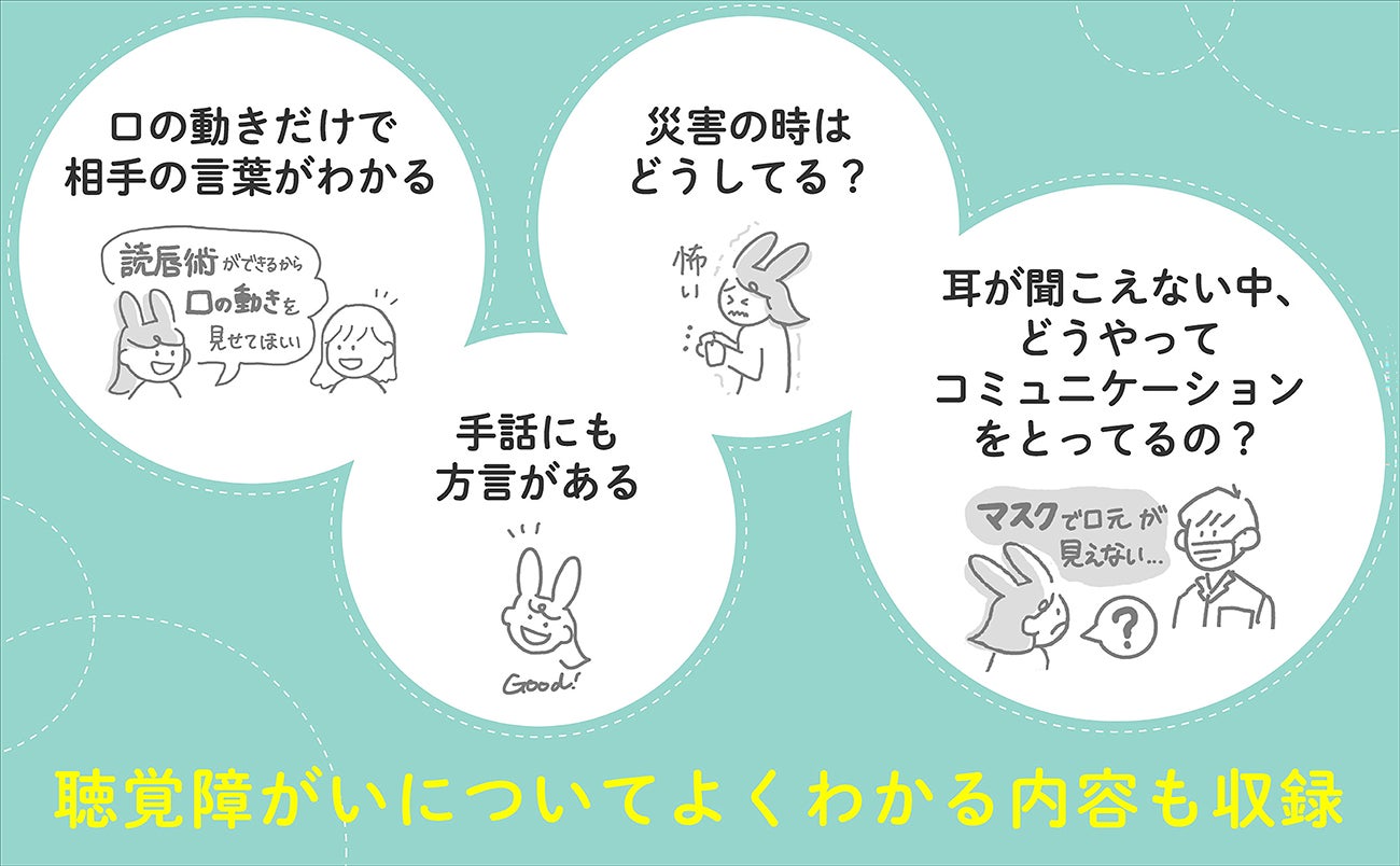 Chapter2では災害時や買い物の時、はじめての人とのコミュニケーションの方法などシーン別に、Chapter3では聴覚障がいの種類や補聴器、手話についてなどを詳しく伝えています。イラストでまとめたページや手話のページもついていて、わかりやすく解説しています。