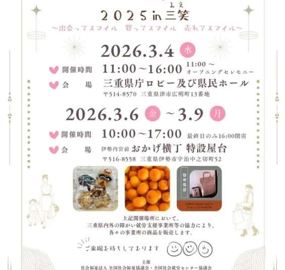本イベントは、社会福祉法人全国社会福祉協議会 全国社会就労センター協議会、認定特定非営利活動法人日本セルプセンター、三重県社会就労センター協議会が主催しています。全国社会就労センター協議会(全国セルプ協)は、1977年に結成され、現在約1,300の障がい者就労支援事業所が加入しており、障がい者の働く場を支える重要な役割を担っています。
