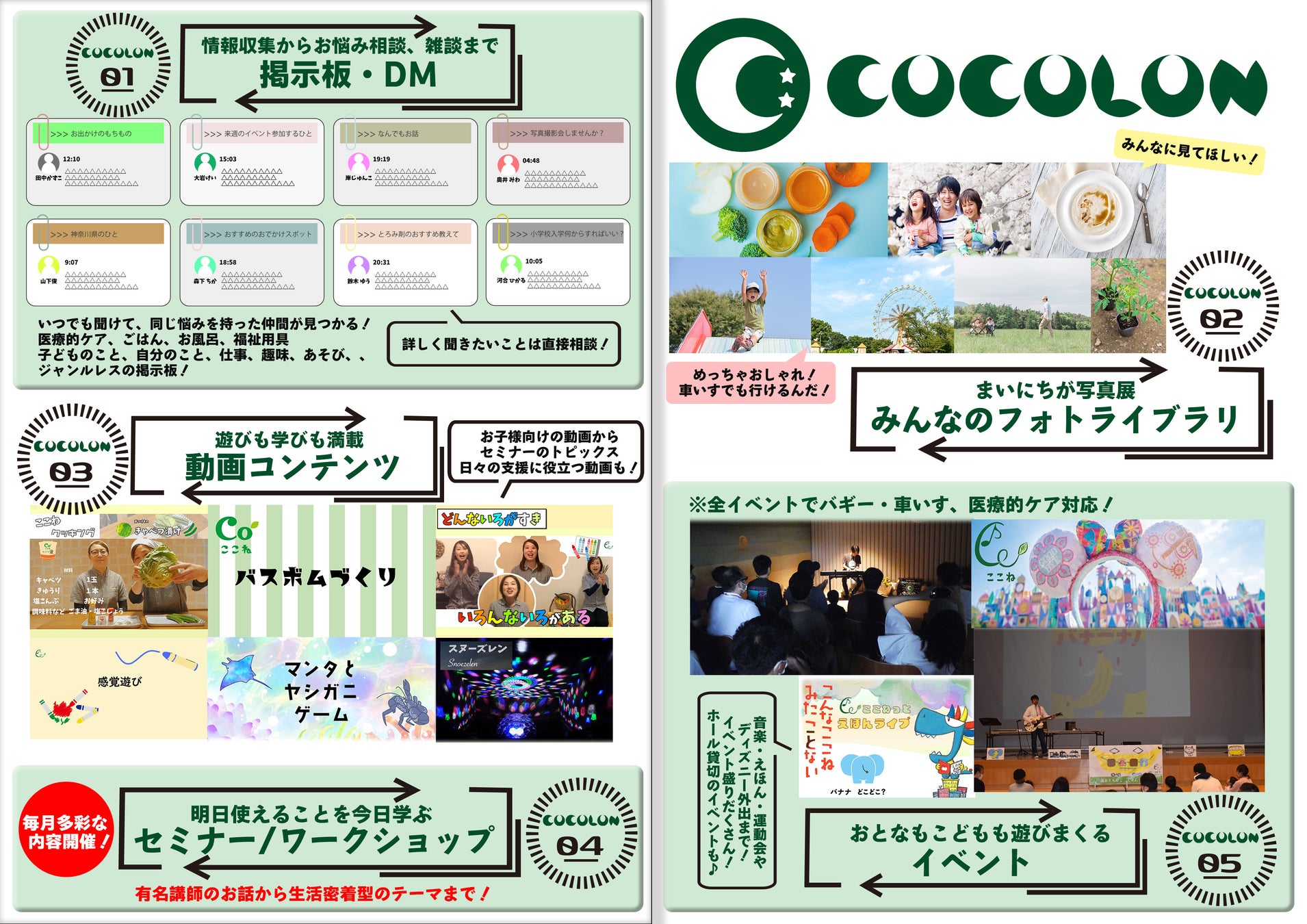 このような想いから、スペシャルニーズを必要とする方たちのご家族同士のつながりが生まれることで、不安なことや質問、子育ての悩みが解決できればと考え、掲示板機能、フォトライブラリ、動画コンテンツ、イベントも整備したオンラインサイトと交流できるオフラインスペースを設立することを決め、8月にフラッグシッププレイス「COCOLON BASE」が公開されました。