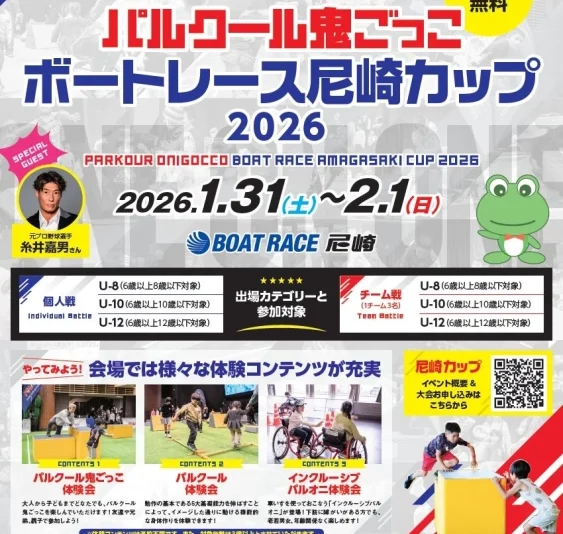 パルクール鬼ごっこボートレース尼崎カップ2026への参加申し込みや詳細については、以下のリンクをご確認ください。