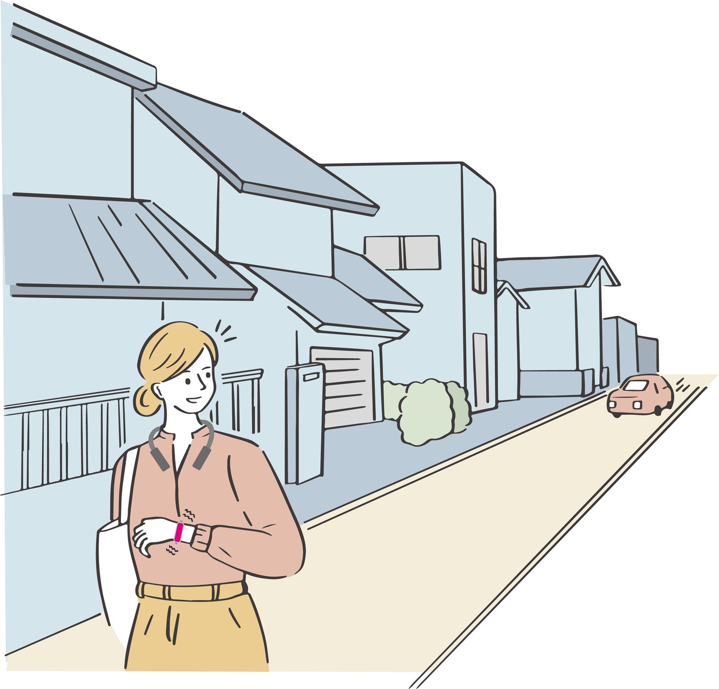 後方から接近する車や自転車をネックデバイスで検知し、リストデバイスの振動で通知します。レーダー検知によって、服や髪の毛による遮蔽、天候変化の影響を受けにくく、接近物を捉えることが可能になります。