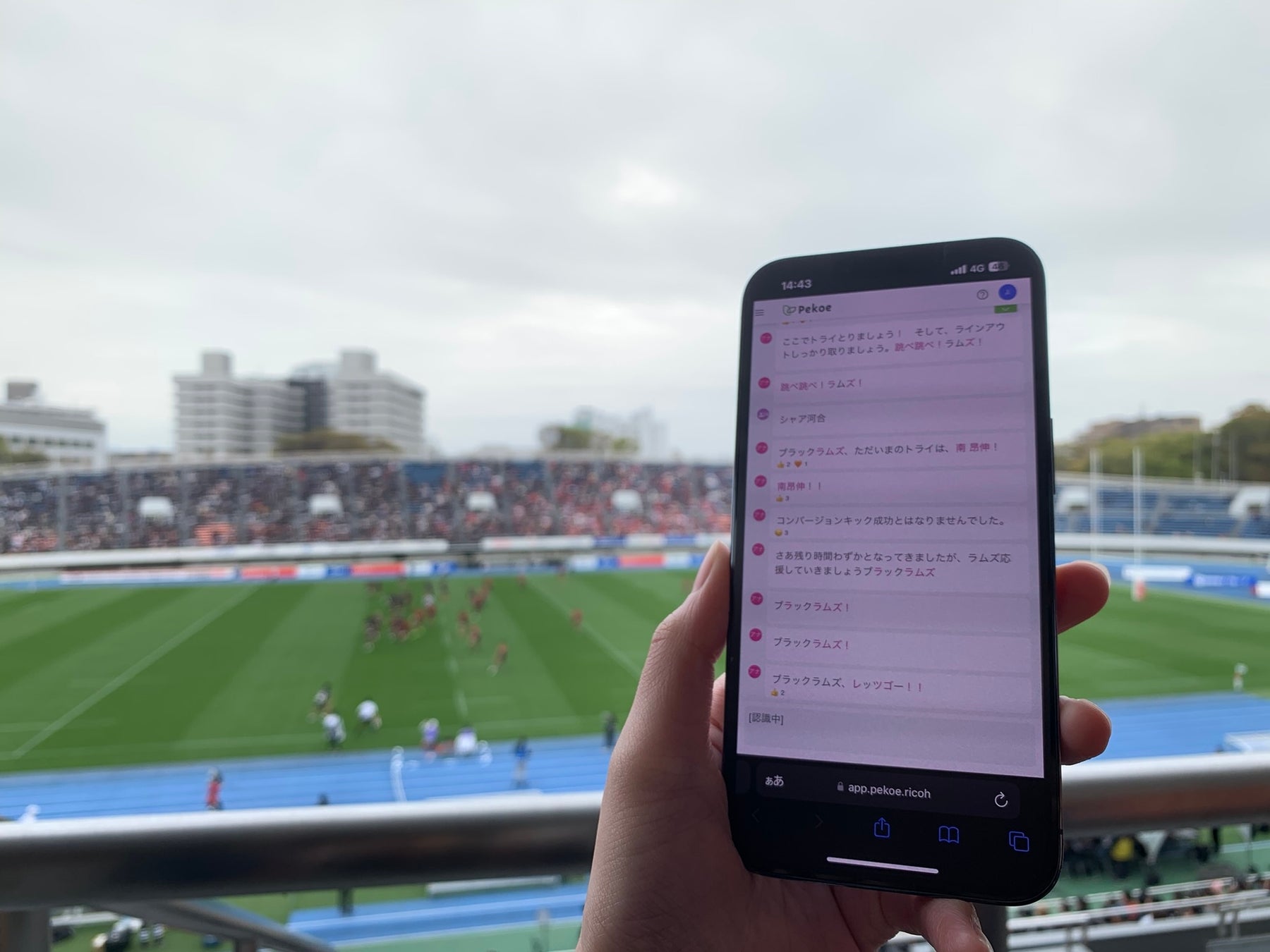リコーは、Pekoeが実現する正確な音声文字起こしの機能を活用して、スポーツの実況可視化に貢献しています。2024年4月と5月には、「誰もが楽しめるラグビー観戦環境」への取り組みとして、リコーブラックラムズ東京の実況文字配信にPekoeを活用しています。