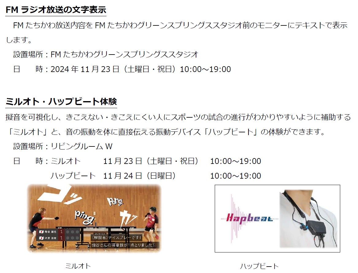 会場では、最先端のユニバーサルコミュニケーション技術を実際に体験できます。音声を多言語でリアルタイムに文字変換して表示する透明ディスプレイや、振動で音を体感できるハップビート、競技観戦をより楽しめるミルオトなど、革新的なデジタル技術が集結。さらに、デフビーチバレーボール日本代表の伊藤碧紀選手によるFMたちかわのラジオ公開収録も実施されます。