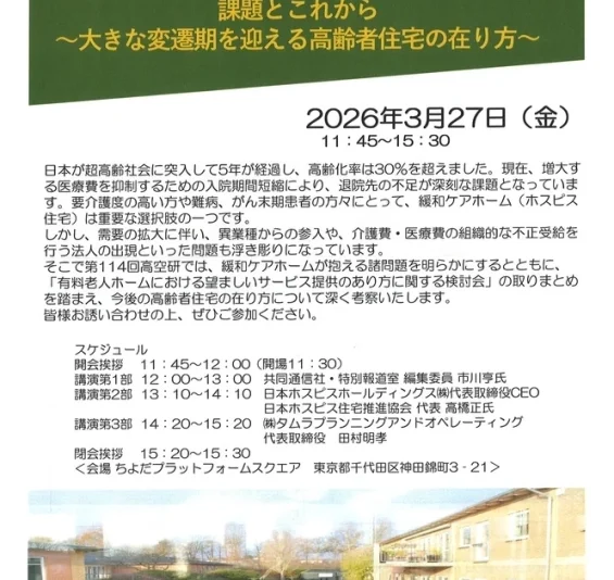 このような背景を受け、「高齢者の豊かな生活空間開発に向けて」研究会が第114回として開催されます。本研究会では、緩和ケアホームが抱える諸問題を明らかにするとともに、「有料老人ホームにおける望ましいサービス提供のあり方に関する検討会」の取りまとめを踏まえ、今後の高齢者住宅のあり方について深く考察する予定です。