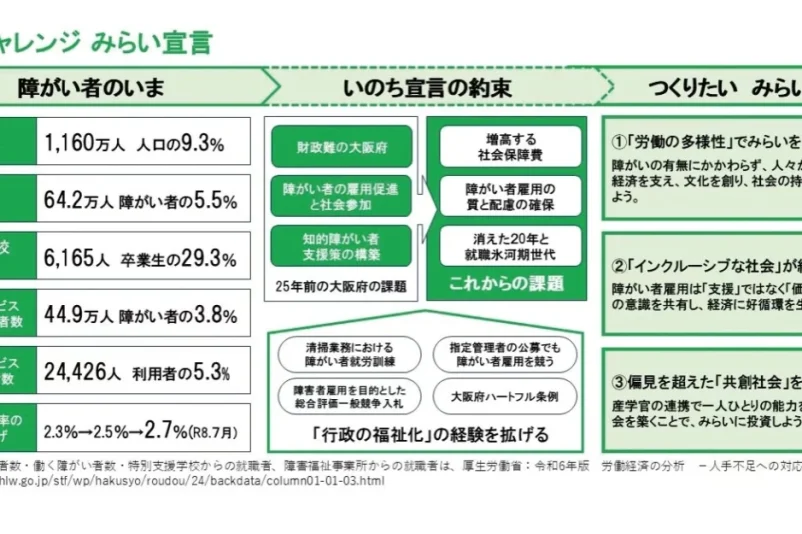 いのち会議は、2050年に向けて、行政・産業・福祉の三者協働で生まれた「行政の福祉化」の25年間の経験を、他の地方自治体や一般事業者にも広げ、「大阪の福祉化」へとつなげていくことを目指しています。エル・チャレンジをはじめとする関係各所と協働し、政策目的を持った公共調達の仕組みづくりを推進することで、誰もが「働きはじめる」「働きつづける」社会の実現に貢献していきます。