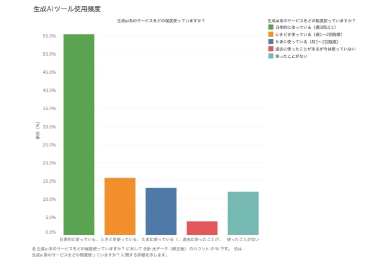 調査結果によると、回答者の半数以上(55.4%)が週3回以上、生成AIを使用しており、週1〜2回程度使用する人を合わせると71.2%が週に1回以上利用していることが分かりました。また、生成AIを使い始めた時期については、回答者の40.7%が2025年から使い始めており、利用者が急速に増加している状況がうかがえます。