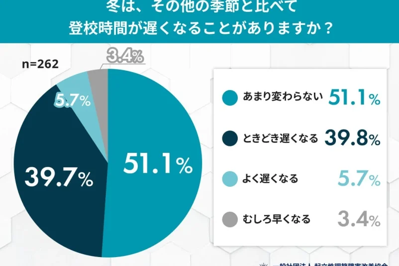 調査の結果、「ときどき遅くなる」(39.8%)と「よく遅くなる」(5.7%)を合わせると45.5%となり、約半数の家庭で冬特有の登校の遅れが認識されていることが分かりました。一方で、「あまり変わらない」と回答した家庭も51.1%ありました。