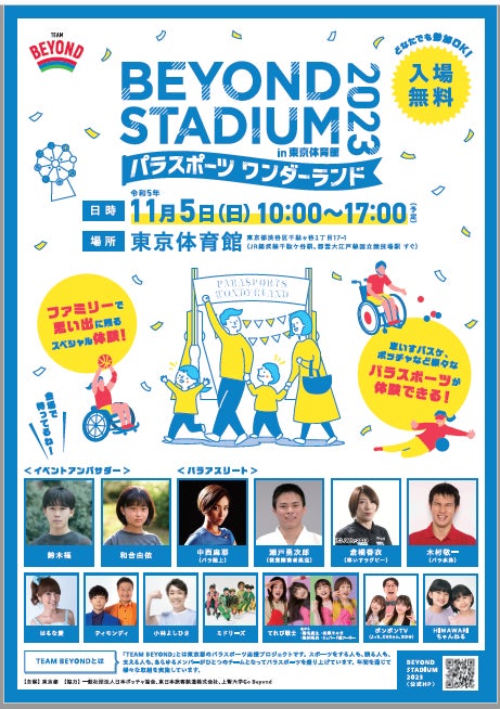 東京都は2023年11月5日(日)に「BEYOND STADIUM 2023 in 東京体育館 ~パラスポーツ ワンダーランド~」を開催。次世代を担う子供たちをメインターゲットに、「ファミリーで楽しめる」「体を動かす」「パラアスリートを身近に感じる」を軸に、楽しみながらパラスポーツへの理解が深まる様々なコンテンツを実施します。