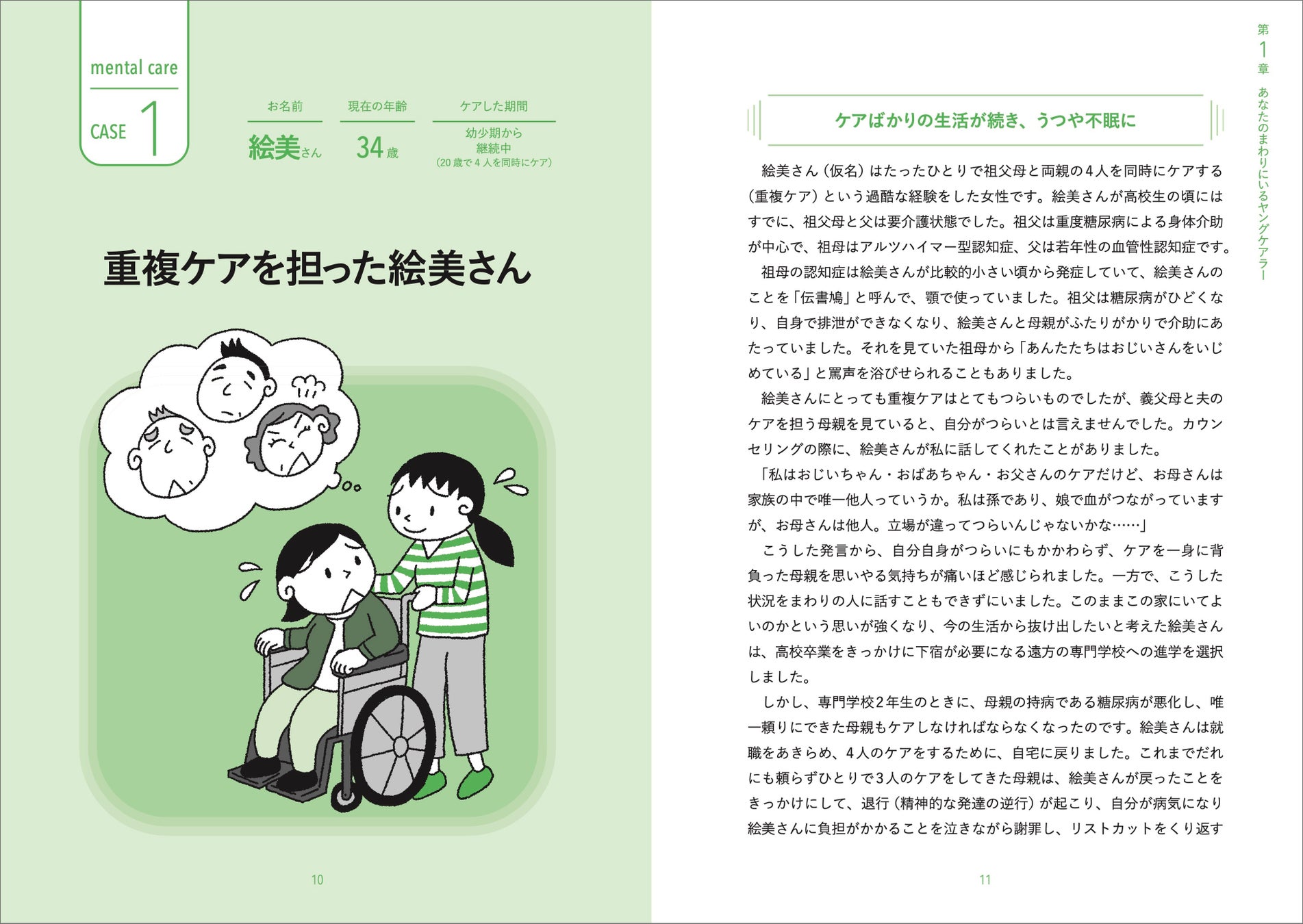- 第1章では、さまざまな背景を持つ、ヤングケアラー当事者の事例を紹介。