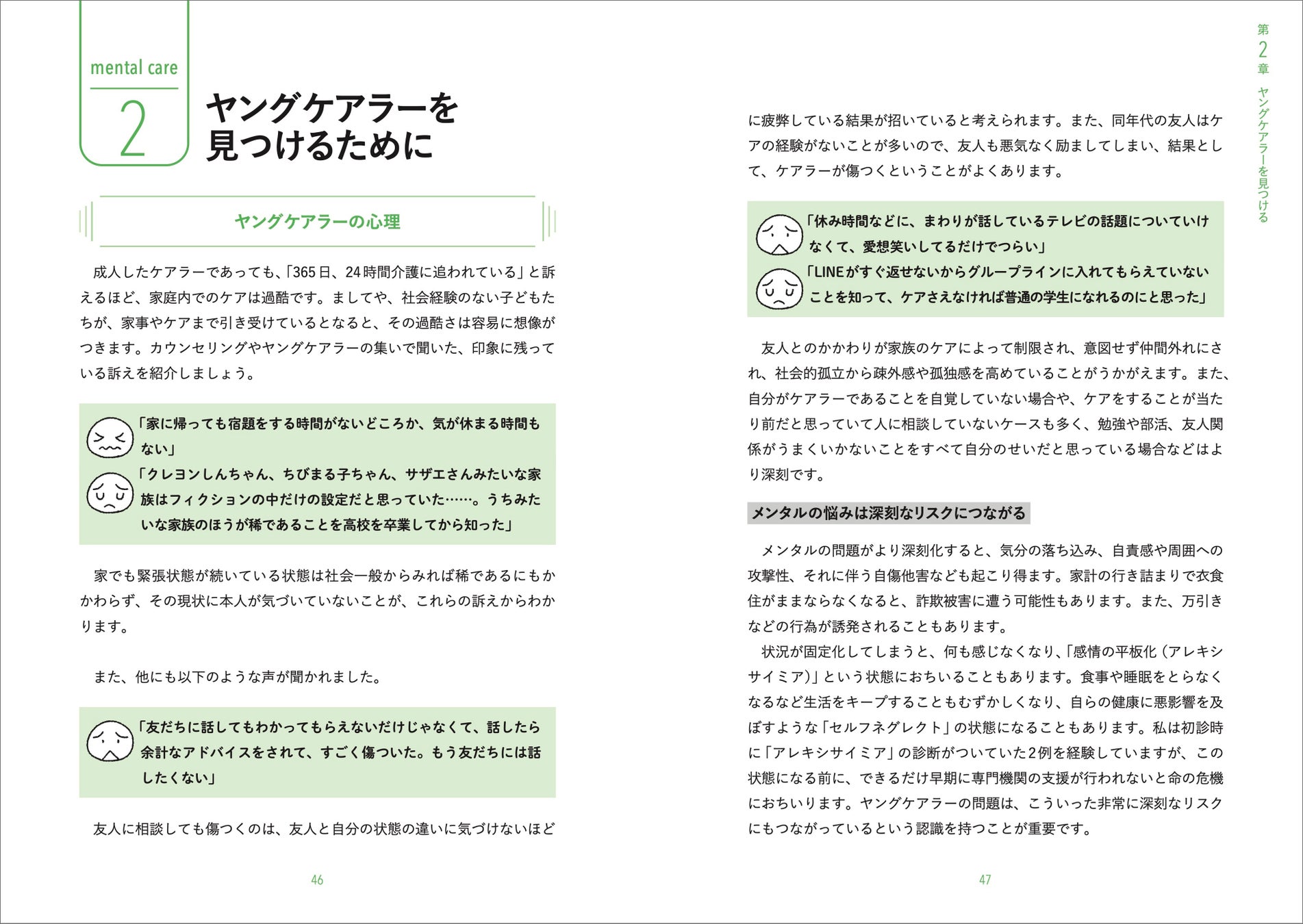 - 第2章では、ヤングケアラーの特徴や国内の支援動向、身近なケアラーに気づくポイントなどを解説。