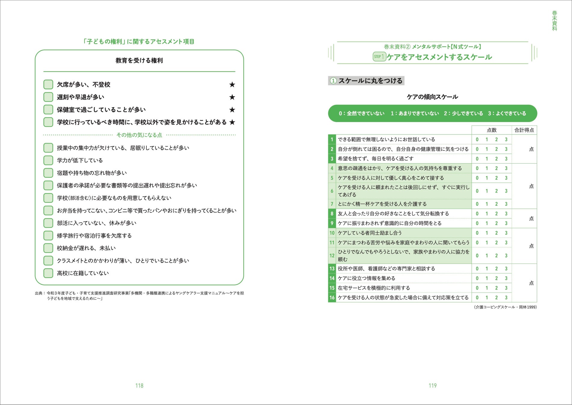 - 巻末には、ケアラーを見つけるアセスメントや、【N式ツール】のスケールを掲載。