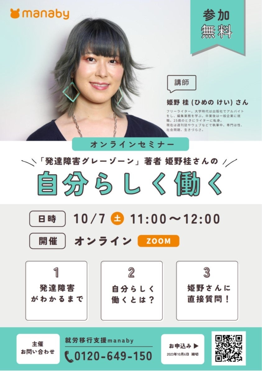 「一人ひとりが自分らしく働ける社会をつくる」ことをミッションに掲げ、障害者就労移行支援事業などのサービスを展開するmanaby(マナビー)は、発達障害(ADHD)の当事者でありフリーライターとして週刊誌やウェブなどで活躍中の姫野桂さんを招いた無料オンラインセミナーを2023年10月7日に開催します。