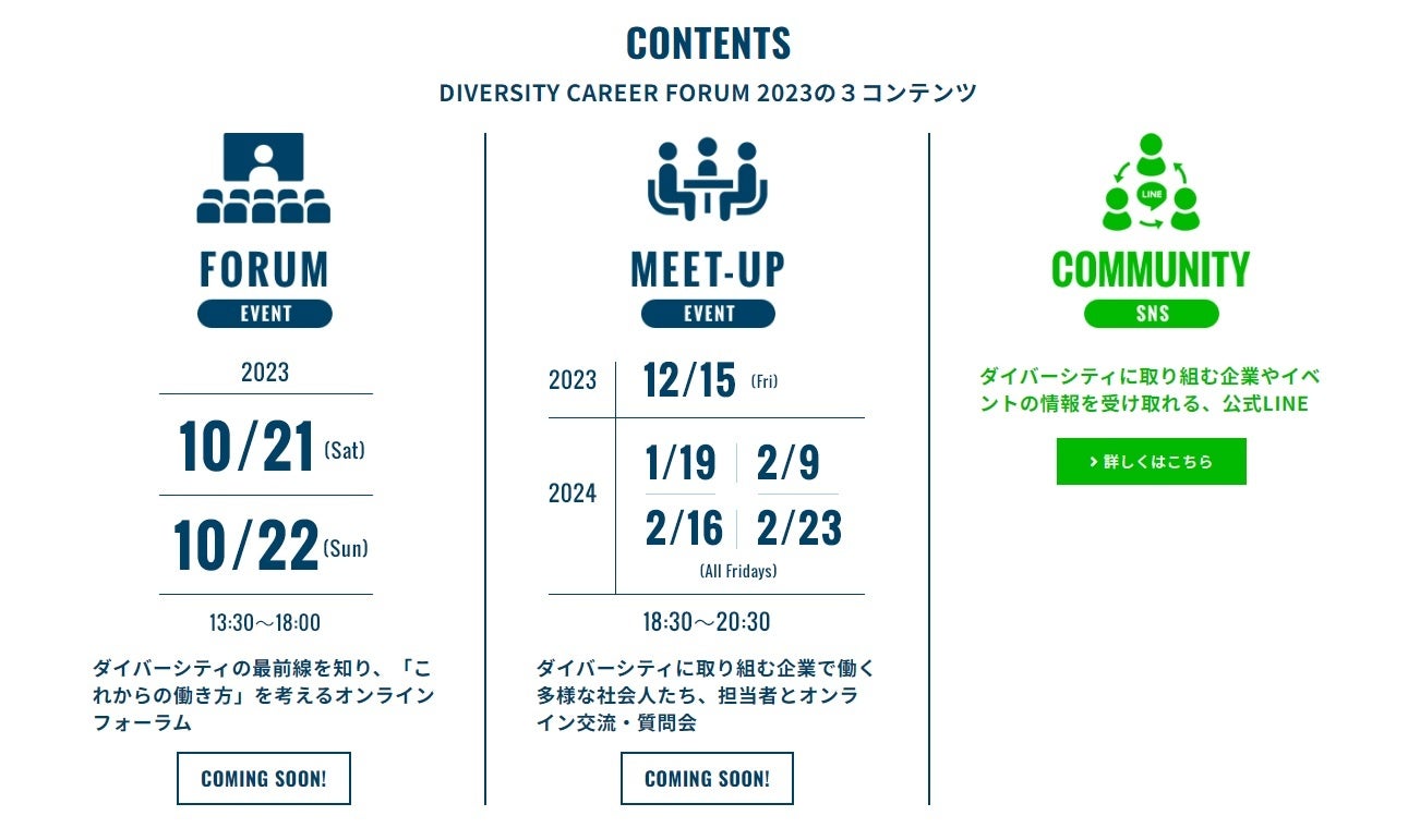 「DIVERSITY CAREER FORUM 2023」では、企業のDE&Iの取り組みや、そこで働くロールモデルとの出会いをたくさん用意しています。本イベントが、マイノリティ性の有無に関わらず、すべての学生・若者たちにとって、自分らしいキャリアの一歩を踏み出すきっかけとなることを願っています。