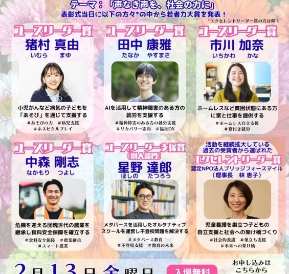 「第17回若者力大賞」の表彰式は、2026年2月13日(金)に六本木ヒルズ ハリウッドプラザ5階「ハリウッドホール」にて開催されます。この表彰式では、今回選出されたユースリーダー賞受賞者5名の中から、最優秀賞にあたる「若者力大賞」が当日発表される予定です。