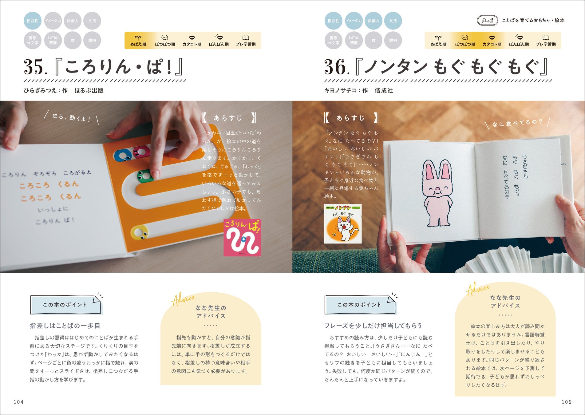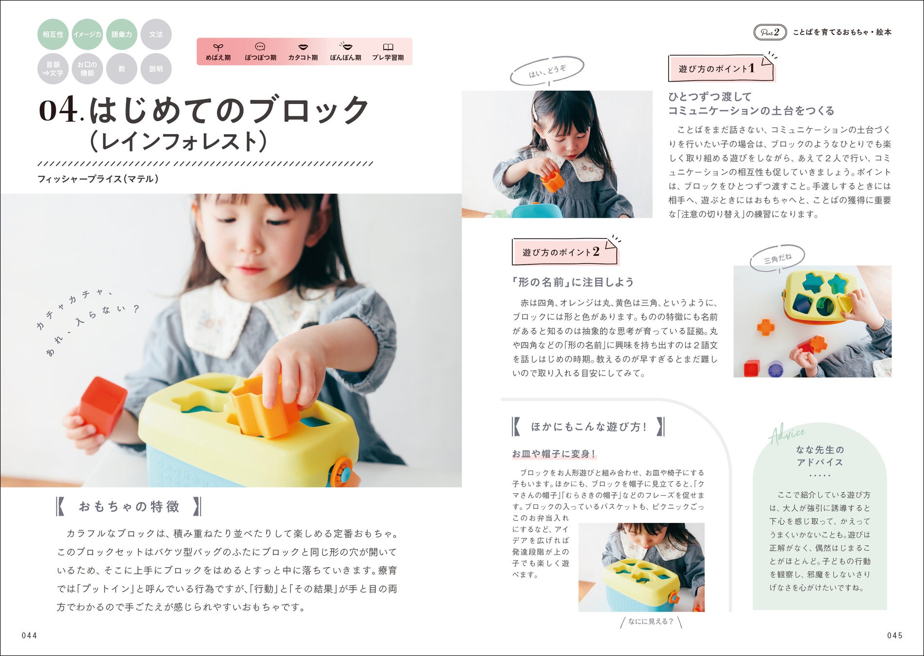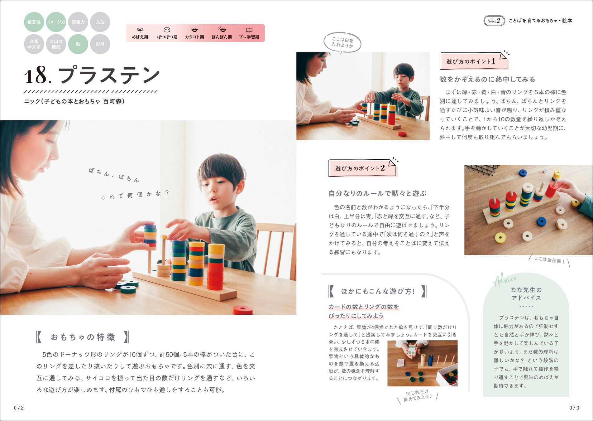 ことばのエキスパートが太鼓判を押すおもちゃや絵本のセレクトがわかるだけでなく、それを使ってどのように遊んだり声かけをしたりするといいのかがわかりやすくまとまっている本です。