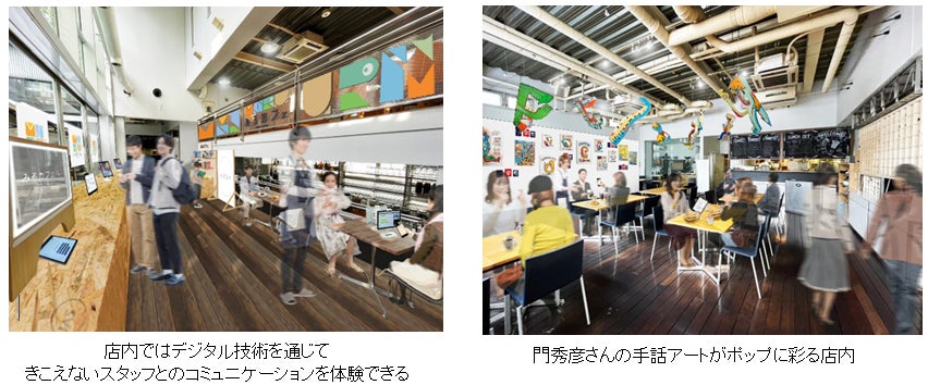 カフェでは、音声又はキーボードで入力した内容を透明ディスプレイ上に表示できる技術や、スマートフォンやタブレット上で音声のテキスト変換、手書き文字の表示が可能な技術、手話をテキストに変換する技術などのデジタル技術を通して、きこえないスタッフを含む店舗スタッフとのコミュニケーションを体験いただけます。