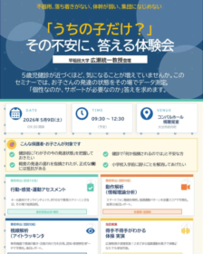 Showing: 1 - 1 of 1 RESULTS 2026年5月9日、大分市で「子どもの発達の困りごと」に焦点を当てた無料体験会が開催されます。早稲田大学の広瀬統一教授が登壇し、アイトラッキングや動作解析といった最新技術で子どもの特性をデータ化。診断前の「グレーゾーン」の子どもたちへの早期支援のヒントを見つけ、保護者の不安を解消する貴重な機会です。
